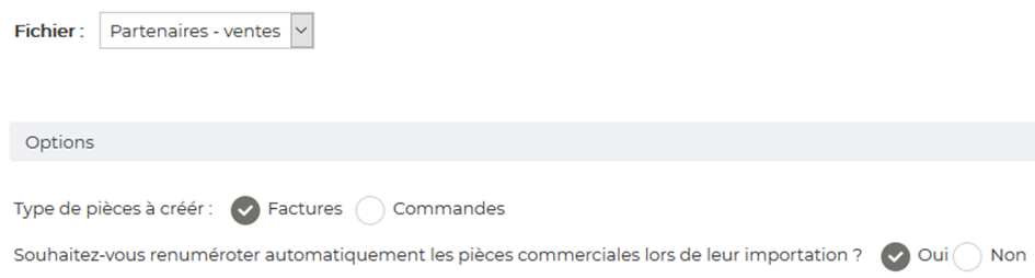 Dans les options d’**import partenaires ventes**, vous avez plusieurs possibilités. Parmi celles-ci, le choix de créer des commandes ou des factures et de conserver ou renuméroter les numéros de pièces importées.