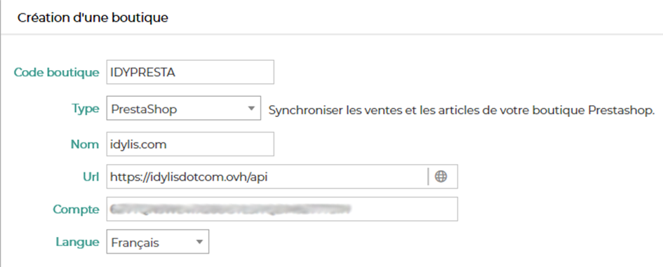 L’URL à renseigner est celle de l’API Prestashop. Par exemple : <https://www.monnomdedomaine.com/api>