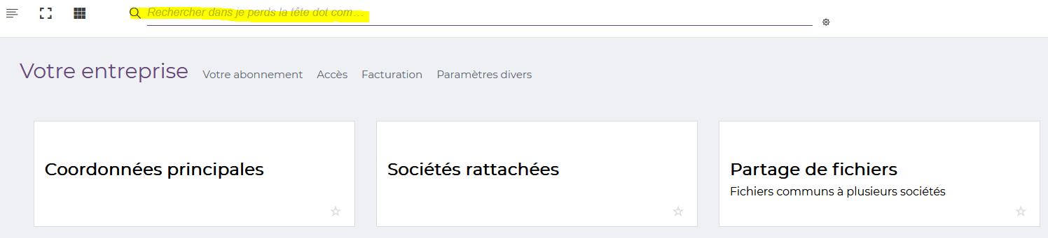 Lorsque vous vous connectez, vous serez par défaut dans la société où vous vous trouviez lors de votre dernière connexion. Le champ de recherche transversale au centre, en haut de votre interface (au dessus du menu principal du module en cours) affiche le nom de la société en cours :